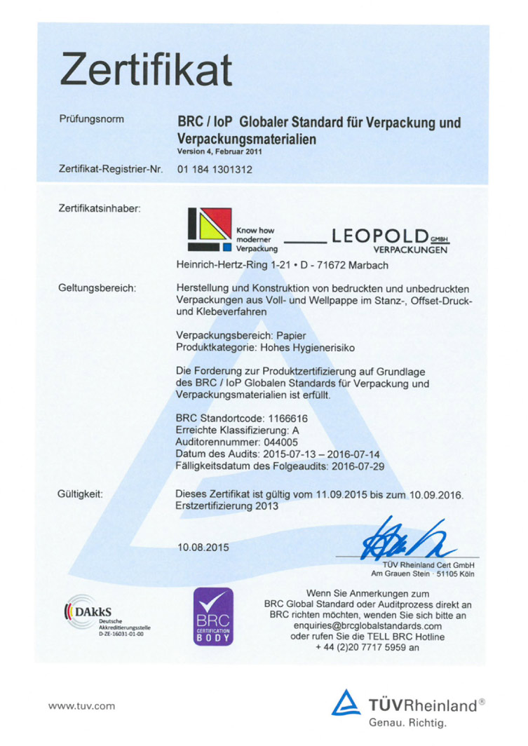 Leopold GmbH, l’un des principaux fournisseurs allemands d’emballages, est naturellement certifié selon la norme BRC-IoP, le standard d’hygiène contraignant défini conjointement par British Retail Consortium (BRC) et l’Institute for Packaging (IoP).